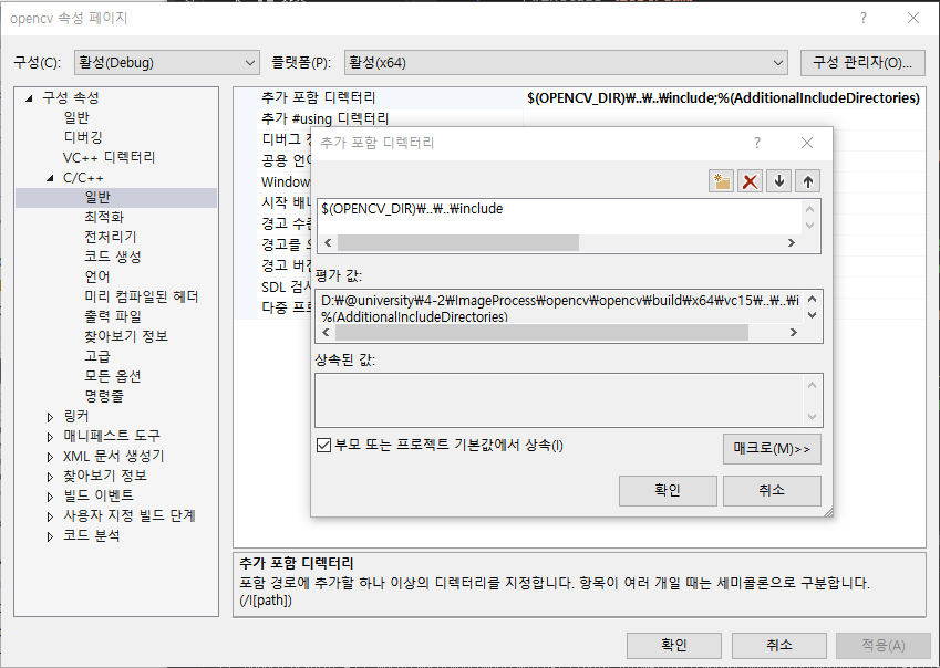그 다음, 프로젝트 탐색기에서, 프로젝트 속성으로 들어가 각종 옵션들을 세팅해주자. 구성 속성(Common Properties) -> C/C++ -> 일반(General)으로 들어가 추가 포함 디렉토리(Additional Include Directory)에 다음과 같은 값을 추가해주자.