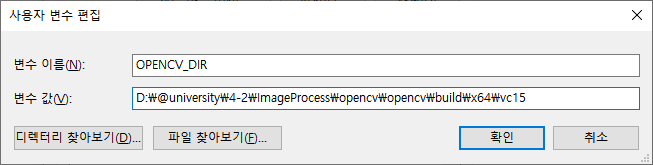 확인을 누르면 OPENCV_DIR이라는 환경 변수가 설정된다.